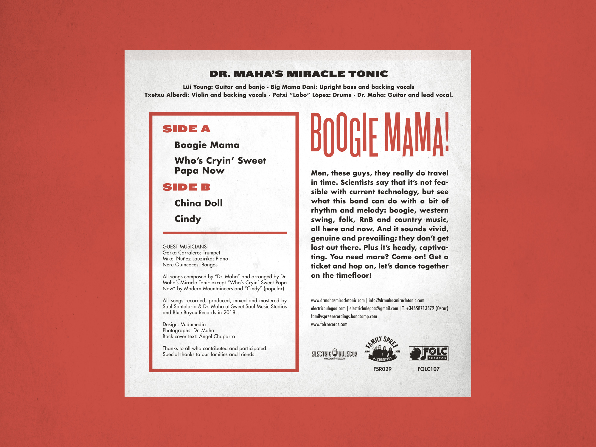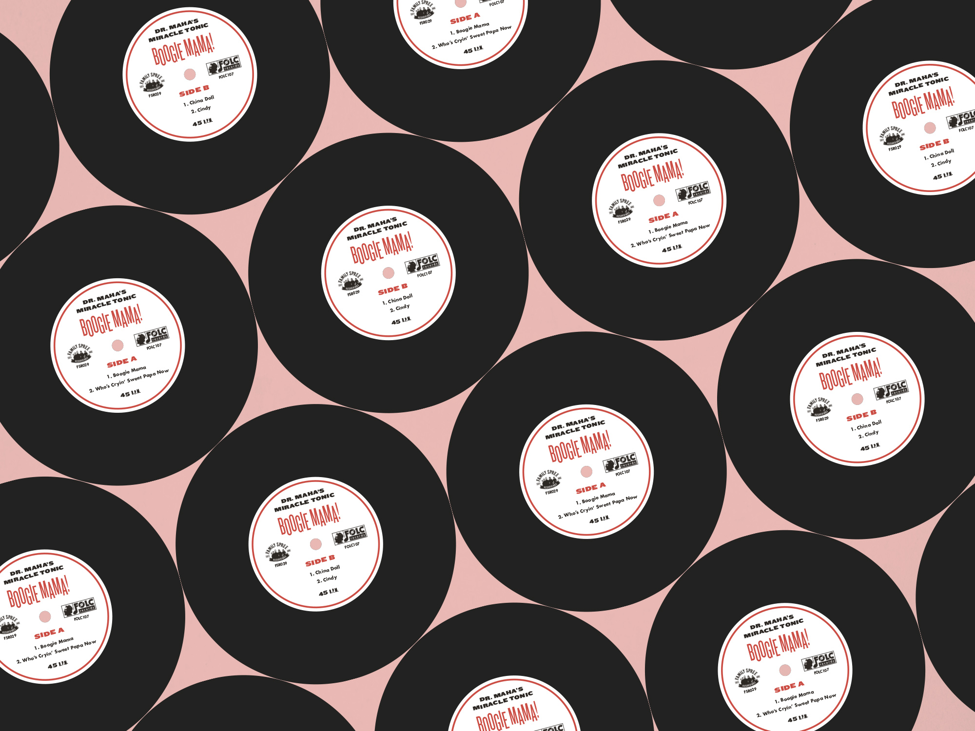 Boogie Mama! Diseño de artwork para single en vinilo de 7″ para el grupo Dr. Maha’s Miracle Tonic titulado «Boogie Mama!». Diseño gráfico
